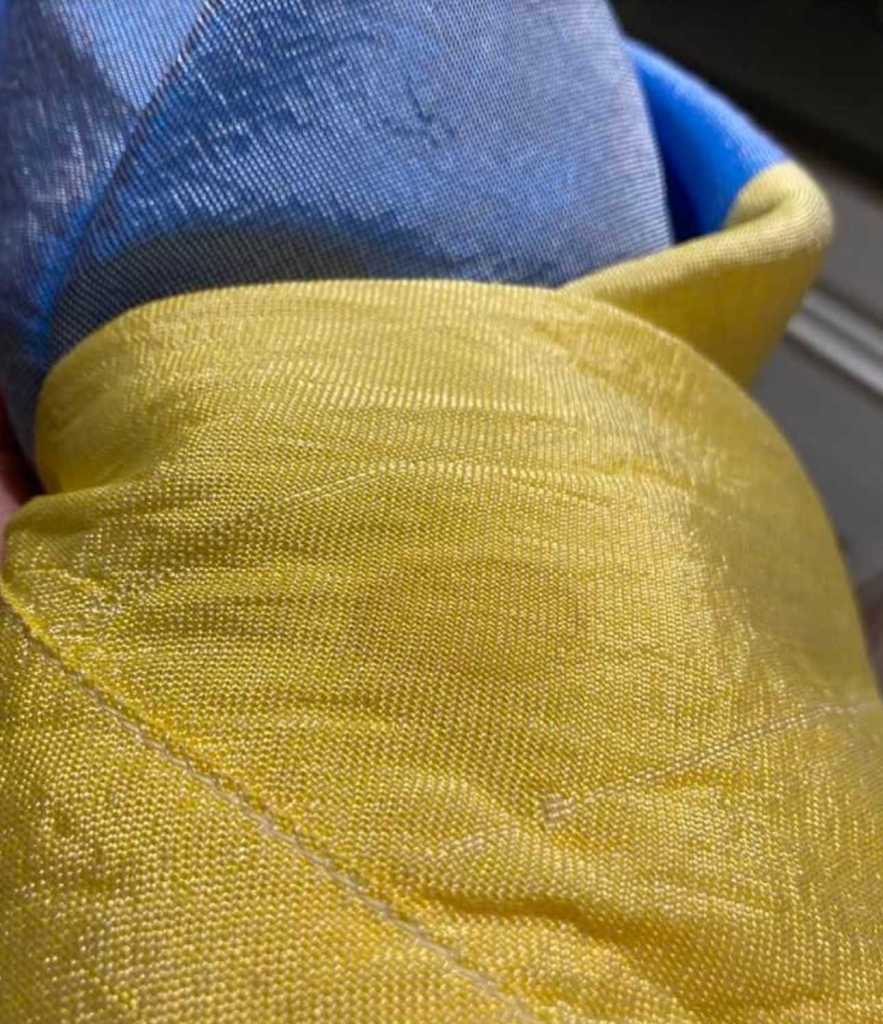 From Dasha Peipon (Ukrainian born, now from Jackson, MS): I was given a Ukrainian flag a while ago. It wasn’t new so I wasn’t too surprised that it was stained and wrinkled. It was probably well loved and well used before – I don’t know the rest of its story, but it made its way to me and I wanted to give it a fresh start and a new home.