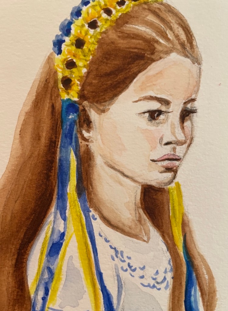 She had on a headband with yellow and blue flowers, and long yellow and blue ribbons streaming down her long brown hair. She was the picture of traditional Ukrainian folklore. I overheard her mom say they were from Ukraine and how thankful they were to go to Norfolk, Virginia, where her sister lived. This precious little one would be safe with her Aunt – another God wink and ray of hope.
