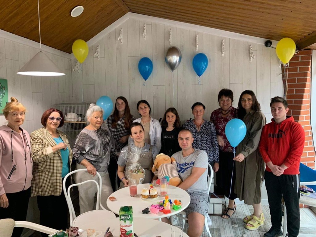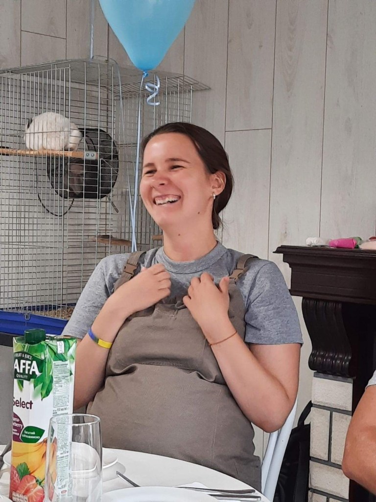 We had a baby shower for Nxxx, who is going to have a baby next month. Nxxx and Pxxxx have been married for a year. A week before the war Nxxx found out that she is pregnant. And then her joy was mixed with worries and fear. They were able to leave the occupied Kherson a month ago. Now they are settled here and feel safe.