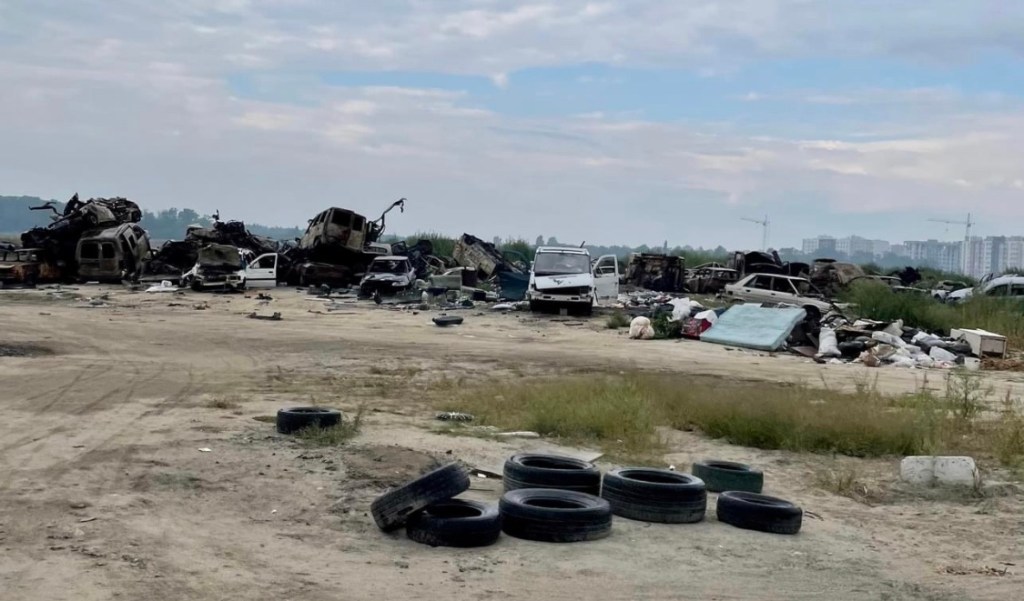 In the pictures, you can see that destroyed cars in Bucha and Irpin’ that are just stacked up in their own rusty graveyards. This is one of the phases of the cleanup efforts. The first step was to just get these destroyed vehicles off the streets. The next step has been to just stack them up in makeshift junkyards before they will eventually be removed. You can also see the famous bridge under which civilians huddled as they tried to escape and which Russia, knowing that civilians were gathered there, ruthlessly attacked.