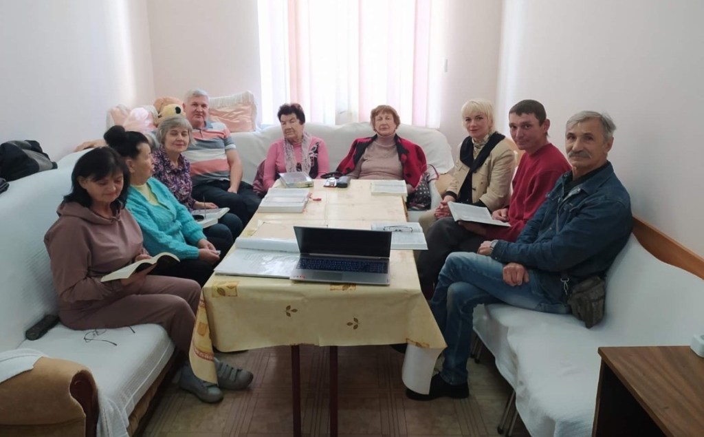 Today Sergey leads a Bible study group that our elder Vitaliy used to lead. They study Psalms now. The man in the front on the photo is Alexander. He joined our church not long ago, but he literally clung to church. He comes to the church every day, works in the yard, helps with cleaning, help to distribute humanitarian aid. After Vitaliy was gone he started greeting people in the church on Sunday and handle bulletins. He is very quiet, not talkative but his actions tell more than his words. He is single- no family, no relatives. But now God gave him a family.