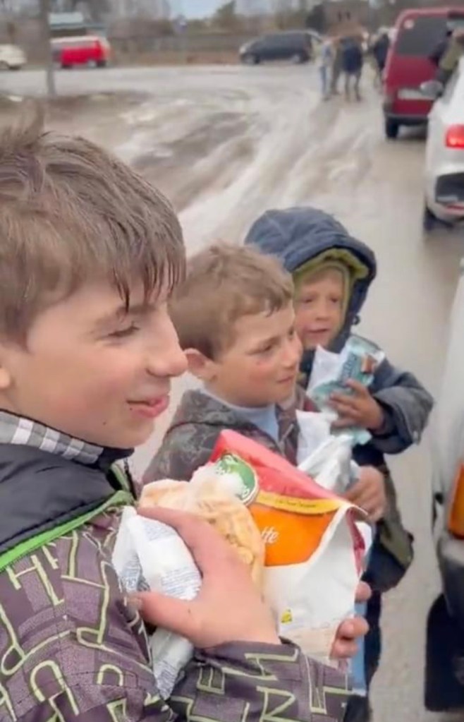 The three scruffy boys in the other picture are hauling off as many treats at they can carry. A young woman from Ukraine’s armed forces had just listened to their tall tales about how each one of them had personally kicked some russian soldiers out of their home town. She then asked them, “Where are your parents?” Their response? “Oh, mom and dad are now both dead.” An adult off camera says that they are currently living with their grandparents.