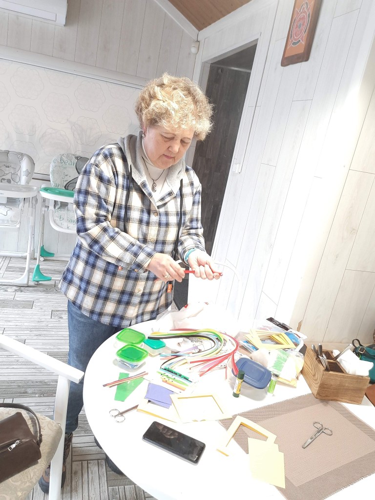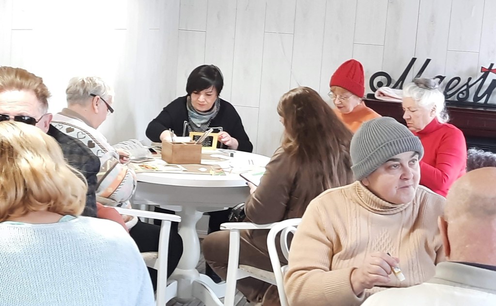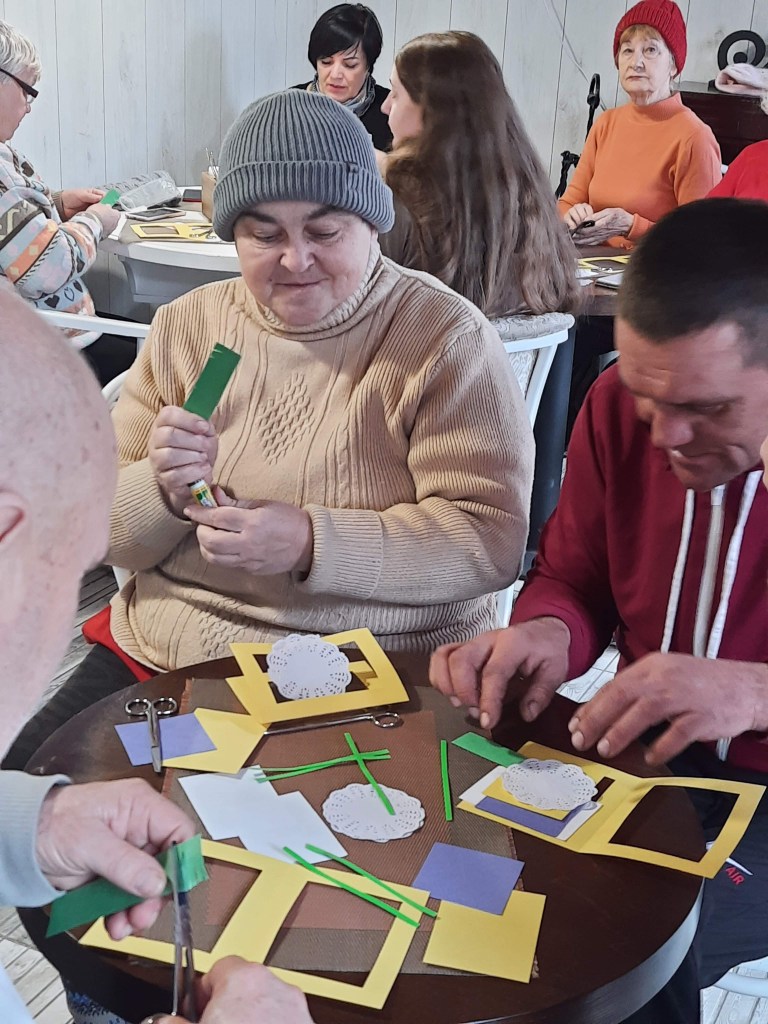 Vladimir who is blind could not do crafts but he liked the atmosphere of creativity. People next to him described what they were doing.