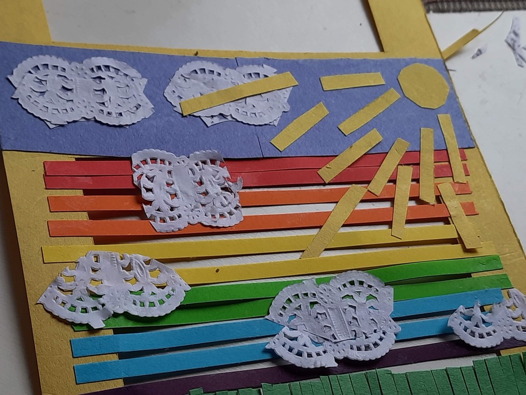 Then we were doing a craft, a nice picture of rainbow of the pieces of colored paper. My dear sister from our church Sveta Lukoshkina prepared the material and helped to do the crafts. It was fun, everybody enjoyed this activity.
