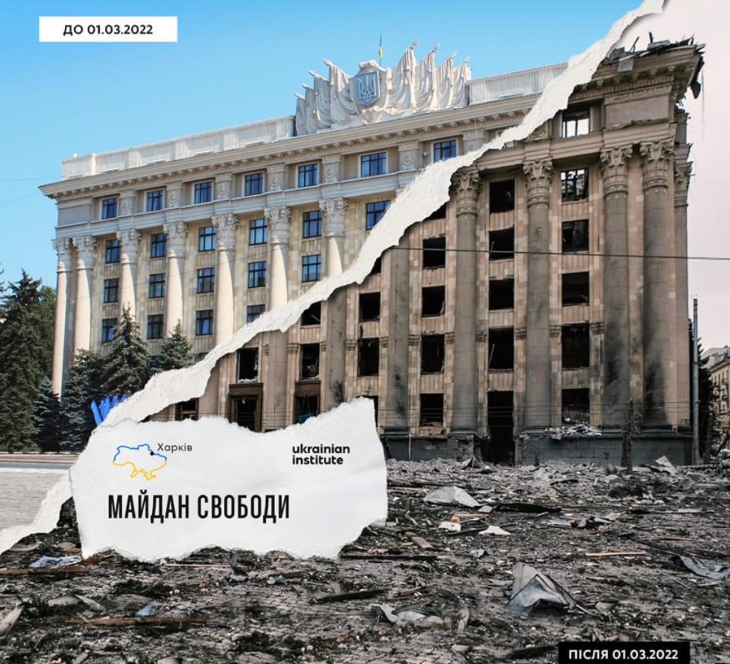 Today’s picture – Kharkiv Freedom Square before and after the attack on March 1, 2022. Postcard shared by the Ukrainian Institute.