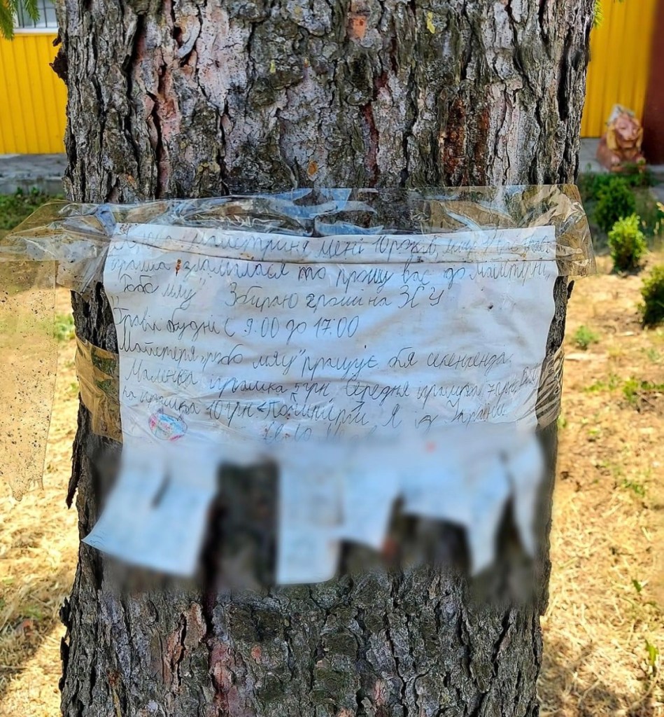 While my son was in the library, I ran some errands, and my eye caught an announcement hand-written on a piece of paper and taped to a tree. It looked like a child wrote it, so I stopped to read it. It said, “I am 10 years old. If you have a broken toy, stop by my repair shop. I am raising funds for the Armed Forces of Ukraine.” It included contact details and prices (the highest one being about a quarter of a dollar) and ended with “I am from Ukraine.”