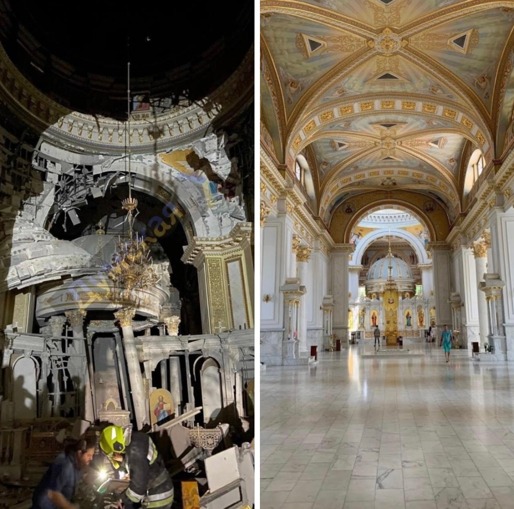 From Jamie Peipon (Day 514): It is unfathomable that this type of madness has carried on every day for 514 days. We’ve become desensitized to it and it can be hard to keep up. Both of these pictures are of the Transfiguration of the Savior Cathedral in Odesa, Ukraine. The darker one was taken tonight. This is not a military site. This is an orthodox church.