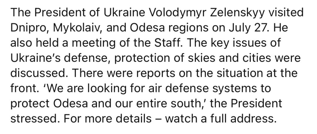 One response to “7/28/2023 – We are looking for air defense systems to protect Odesa and our entire south – Zelenskyy”