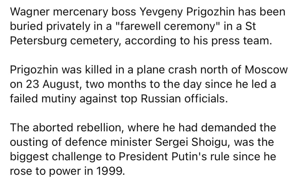 8/30/2023 – Yevgeny Prigozhin buried without fanfare and working-class cemetery