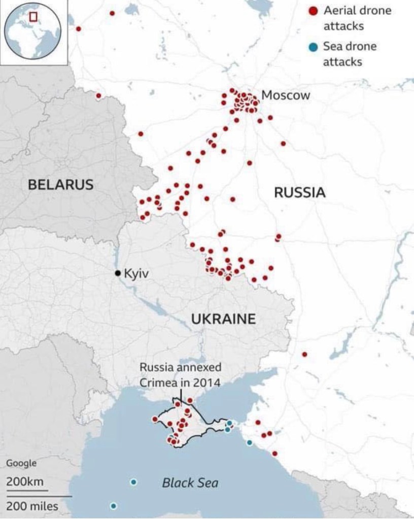 From BBC: This map by BBC highlights the extent of recent Ukrainian drone strikes on targets inside russia and russian-occupied Crimea