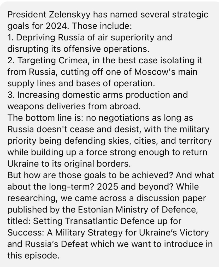 1/13/2024 – Strategy for Ukraine’s Victory and Russia’s defeat. Artillery, UAV’s, Air-Defense, Manpower