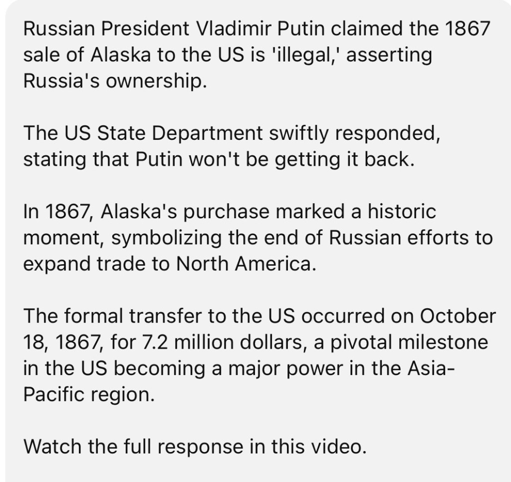 2/1/2024 – US State Department response to Russian President Putin‘s claim over Alaska