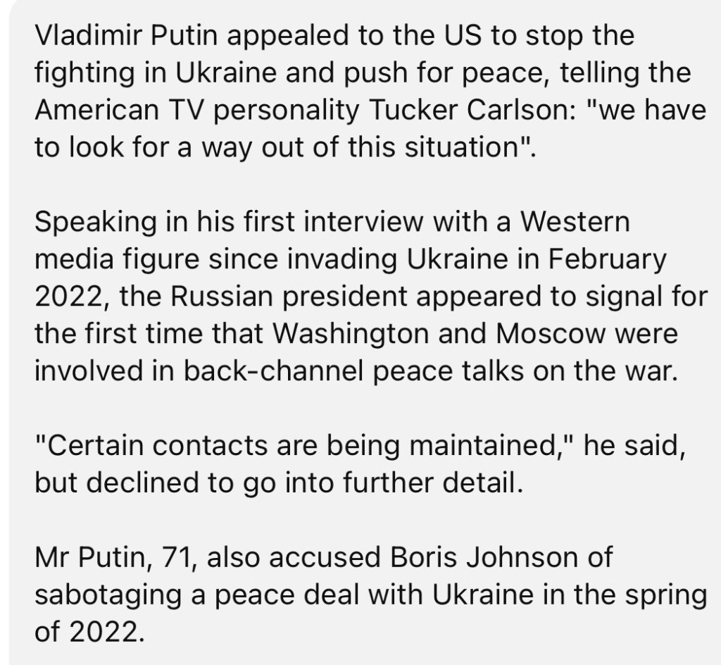 2/9/2024 – Lies? Putin hints Moscow and Washington in back-channel talks in revealing Tucker Carlson interview