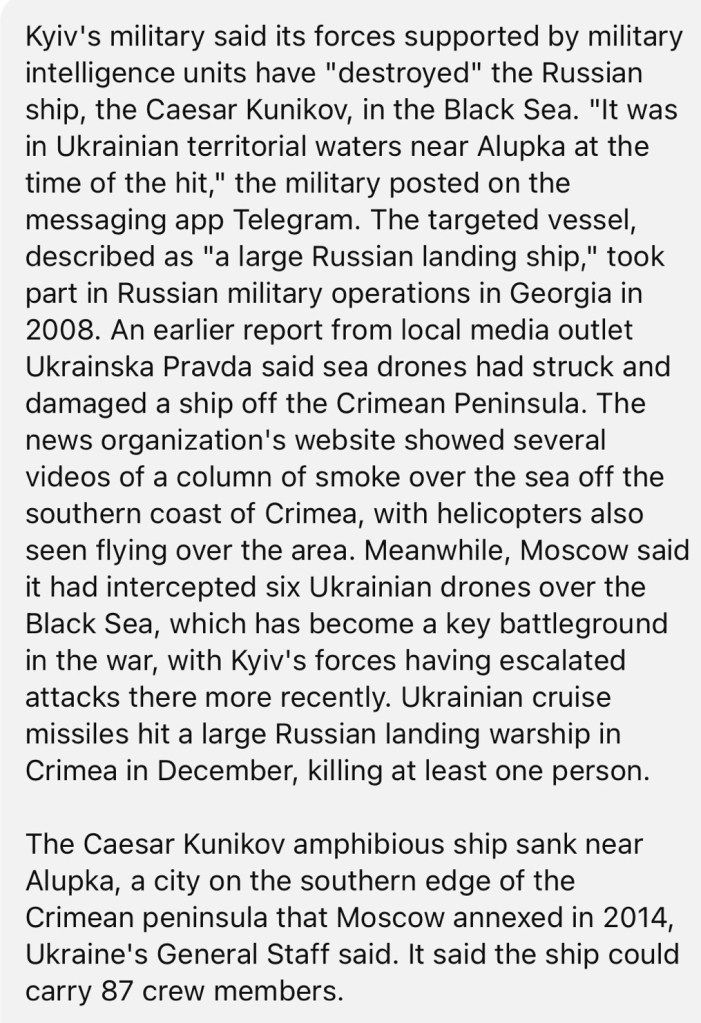 2/14/2024 – Ukraine says it’s successfully destroyed a Russian landing vessel in the Black Sea