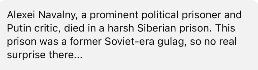2/17/2024 – Russian opposition leader, Alexei Navalny, Dies in Prison