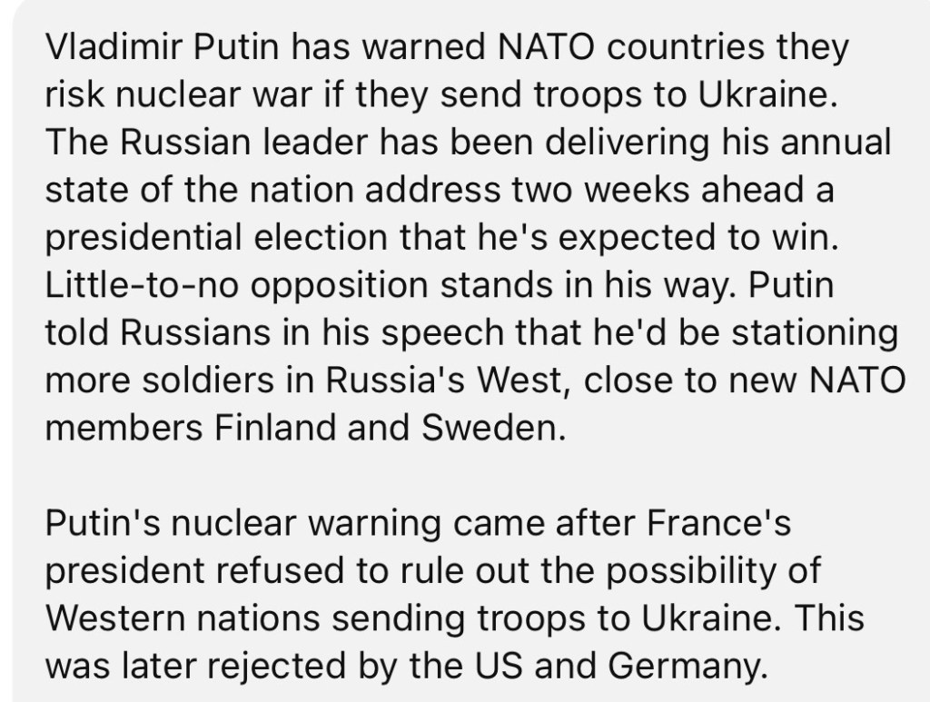 2/29/2024 – Putin threatens nuclear war, if the West sends troops to Ukraine
