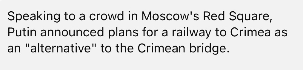 3/20/2024 – Putin plans 450 mile railway to Crimea if bridge destroyed