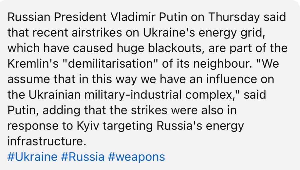 4/12/2024 –  Putin says Ukraine energy site strikes came to demilitarize country