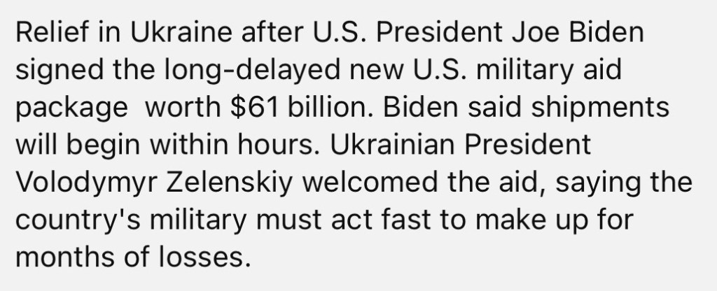 4/26/2024 – Ukraine promises to act fast after President Biden approves long-delayed US military aid package