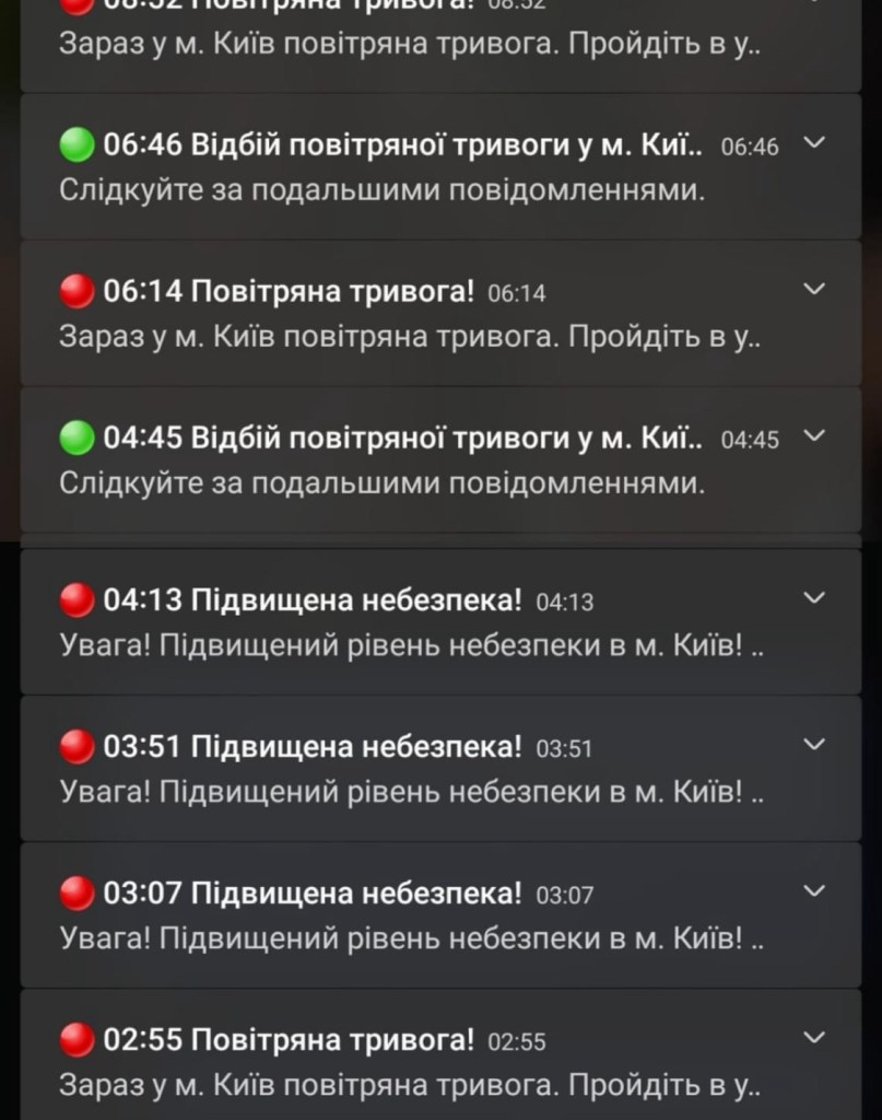 Today’s picture shows siren notifications on my phone. You can see the time of these. Several red ones in a row mean the beginning of the air raid and increased danger alerts for our location when we are warned not to ignore the sirens, as missiles are definitely coming our way. The green notifications mean that the air raid is over.