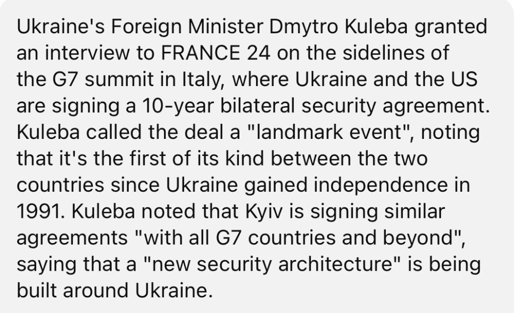 6/14/2024 — Ten-year security deal between US and Ukraine is ‘landmark event’, FM Kuleba says
