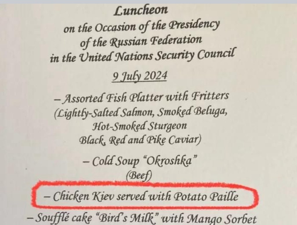 Meanwhile, next day after that deadly missile strike on July 9th ruzzia presided in UN Security Council and to celebrate their presidency ruzzians hosted a luncheon in the UN, featuring the Ukrainian dish chicken Kyiv on the menu.