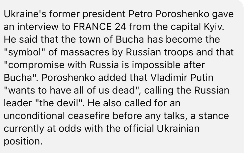 7/30/2024 — ‘Compromise with Russia is impossible after Bucha’: Ukraine’s ex-president Poroshenko