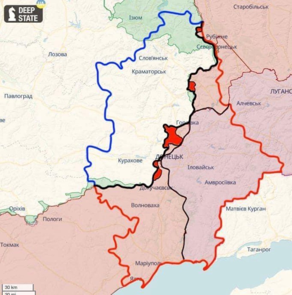 From: Roman Sheremeta—It is important to understand just how big of a failure was russian offensive on Ukraine in the past year. The map shows a Donetsk region. In red are all russian “successes” in one year. In one year!