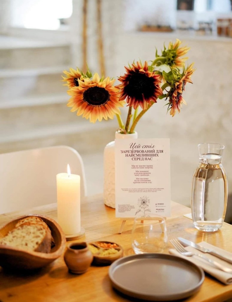 In memory of the fallen defenders, Ukrainian restaurants started a tradition of setting aside a few tables as if reserving them for those who will never come. These tables usually have sunflower bouquets because many soldiers were killed in the sunflower field near Ilovaisk.