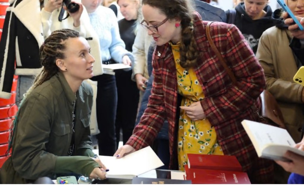 Ukrainian soldier and poet Yaryna Chornohuz meets readers in Mykolayiv on the tour of frontline cities.Photograph: Olexander Kornyakov