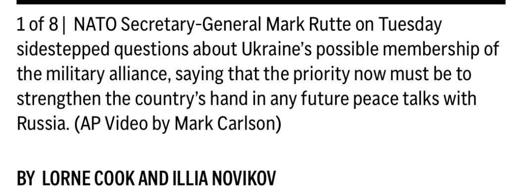 From: AP – BRUSSELS (AP) — NATO Secretary-General Mark Rutte on Tuesday sidestepped questions about Ukraine’s possible membership in the military alliance, saying that the priority now must be to strengthen the country’s hand in any future peace talks with Russia by sending it more weapons.