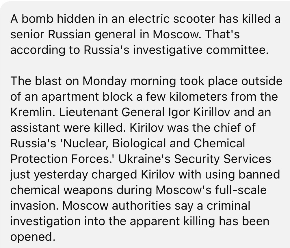 12/17/2024 — Bomb kills chief of Russian nuclear protection forces Igor Kirillov in Moscow