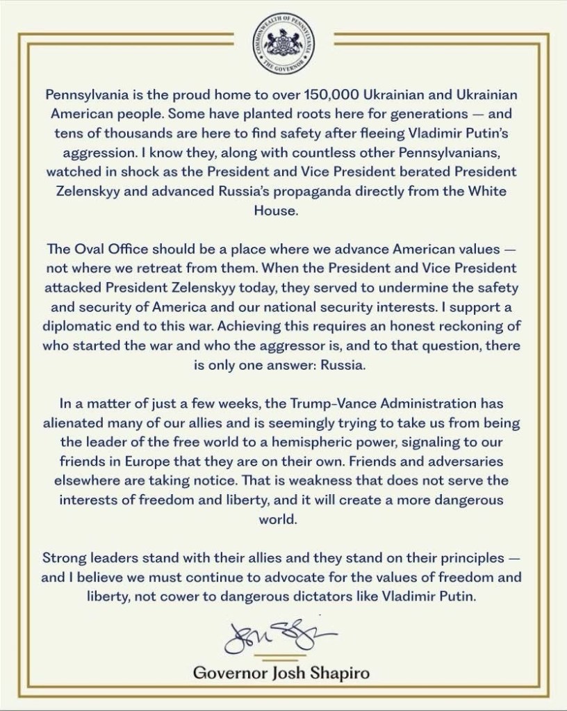 From: Office of the Governor of Pennsylvania — Pennsylvania is the proud home to over 150,000 Ukrainian and Ukrainian American people. Some have planted roots here for generations – and tens of thousands are here to find safety after fleeing Vladimir Putin’s aggression.