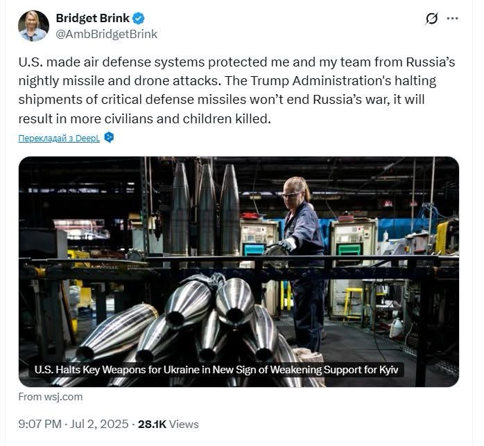 From: Euromaiden Press — The former US ambassador to Ukraine who stepped down after Trump’s inauguration just slammed the Pentagon’s decision to halt critical air defense shipments
