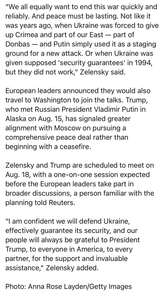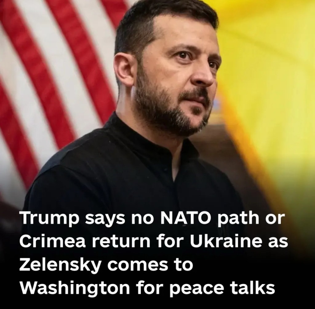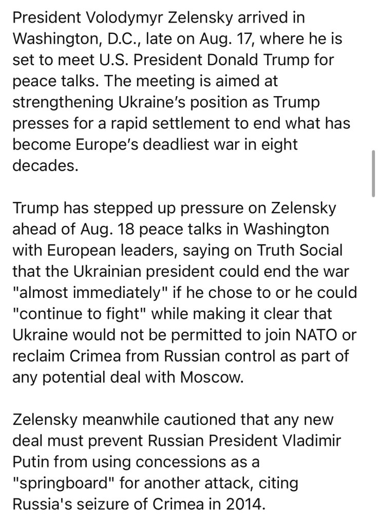 8/18/2025 — Trump says no NATO path or Crimea return for Ukraine as Zelensky comes to Washington for peace talks