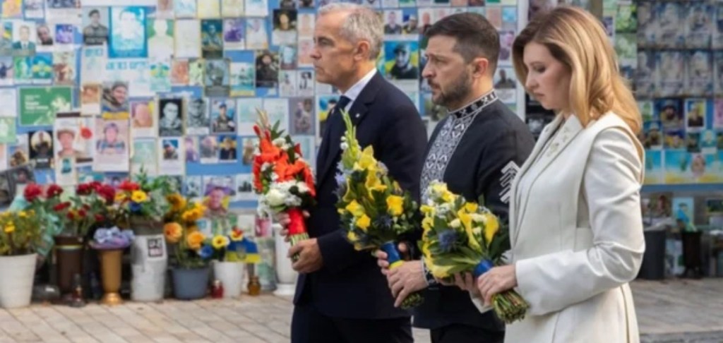 Olena Zelenska and Volodymyr Zelenskyy walked through an alley honoring fallen soldiers and, alongside Canadian Prime Minister Mark Carney, laid flowers at the Wall of Remembrance. The presidential couple also joined the traditional Prayer for Ukraine at Saint Sophia Cathedral.